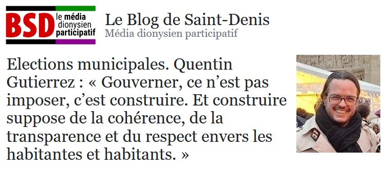 Le 8 janvier 2026, Quentin Gutierrez, tête de liste A.G.I.R., a répondu aux questions détaillées de blogsaintdenis.fr, média d’information locale de référence. Cette interview approfondie explore son diagnostic de la situation dionysienne, ses propositions programmatiques et son positionnement politique.
